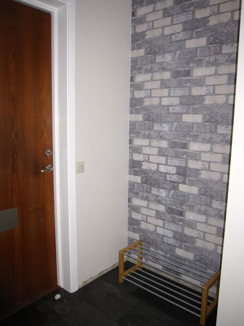 Nytt golv. Väggarna målade i färgen Linne och väggen är inte en mur, utan tapet. Golvsocklarna blir vita men har inte hunnit torka när bilden togs. En hatthylla i samma stuk som skohyllan kommer att sättas upp till helgen. Lägg märke till att smutsen kring lamp-knappen är borta på den under bilden…..