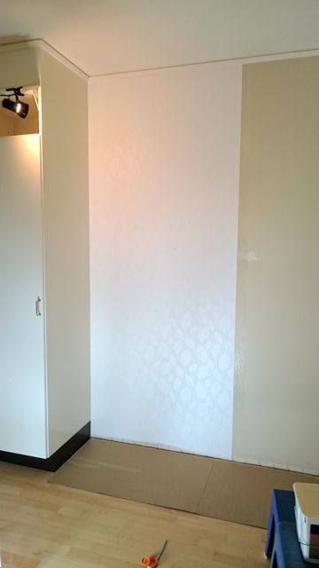 Golvet är klart. Vi skyddar det med en kartong och så har vi satt upp den första tapetvåden. En nästan vit med löv i silver. Ljust och fint.