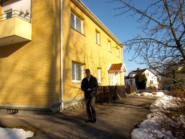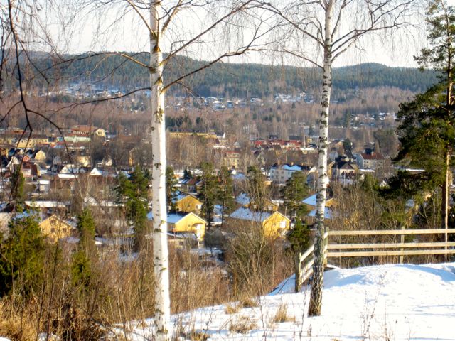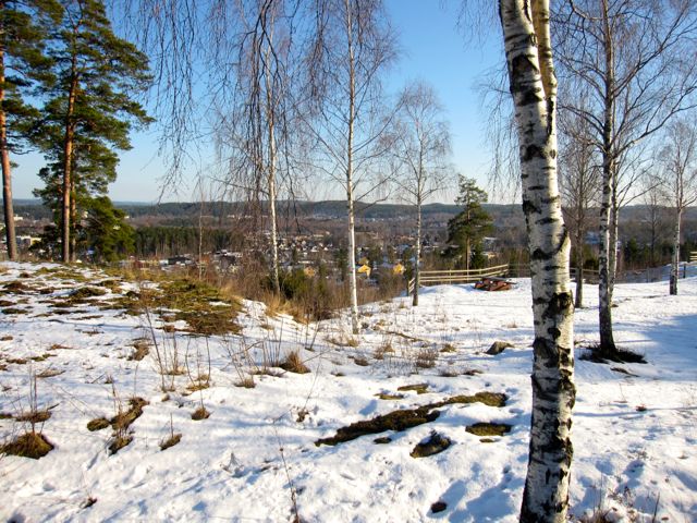 De gula husen mellan björkarna är grannhusen till vårt hus, som är lite skymt