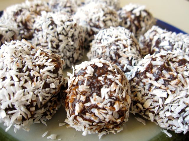 Mixa allt i matberedare. Forma till bollar och rulla dem i kokos. Fukta gärna händerna i kallt vatten, så kletar det lite mindre.
