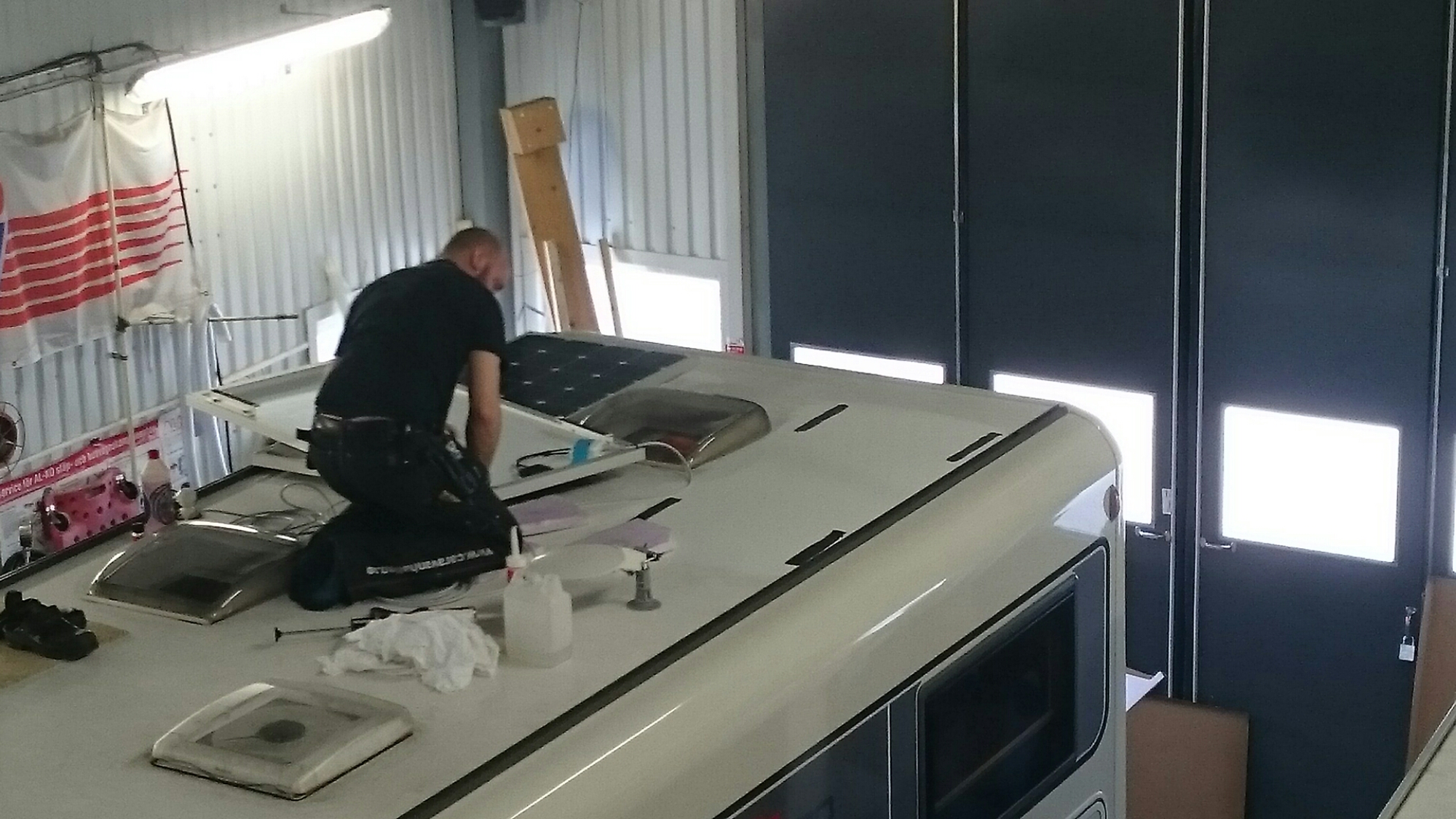 Direkt på morgonen fick husbilen komma in i verkstadshallen. Vi ska ju få solpaneler monterade. Tommy förberedde allt och sedan klättrade han upp på taket. Tvättade och limmade efter konstens alla regler. Det märktes att det inte var den första panelen han monterade. Det är duktiga killar på Verkstaden.