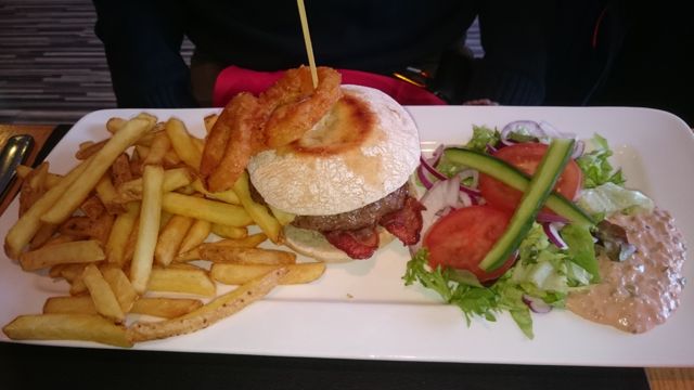 Ydreburgare De Lux med lökringar och bacon Och nån väldigt god röra