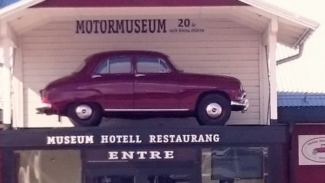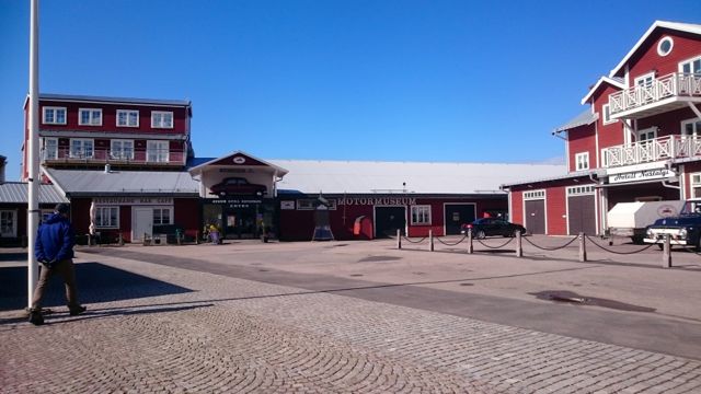 Motormuseum vid Motala hamn. Ett besök här får vänta till en annan gång. Vi har nu börjat bli fikasugna så vi tar det långa benet först och knallar tillbaka till husbilen