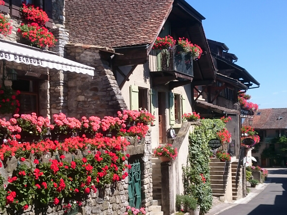 Idag blev det ett besök i den gamla staden Yvoire. Den är hur mysig som helst med sina små kullerstensgator, blommor, så butiker och prisbelönta restauranger. Vi måste naturligtvis kolla några, alldeles färska, macarons. De är så vackra, när de ligger i långa färgglada rader.