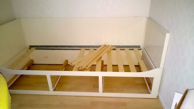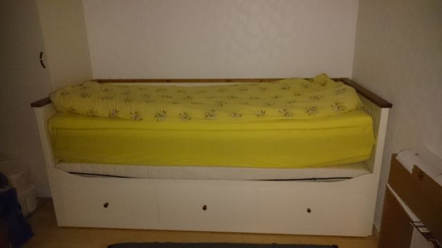 Vi har funderat ett tag på att köpa en gästsäng till vårt gästrum. Vi har kikat på både nytt och begagnat och kommit fram till att Hemnes gästsäng från IKEA nog är ett bra val. Den funkar mkt bra som enkelsäng och är lätt att dra ut till en dubbelsäng på 160 cm. Därför började vi kika på Blocket om en begagnad. Hittade nån vi ringde på som redan var såld. Men så hittade jag en nere i Jönköping till ett bra pris. Sagt och gjort – vi slog till och husbilen fick agera flyttbil.