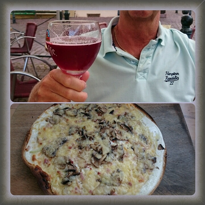 Eftersom vi är där vi är, blev det naturligtvis en Flammenkushe/ Tarte Flambee till kvällsmat. Nersköljd med Körsbärsöl som var gott men annorlunda