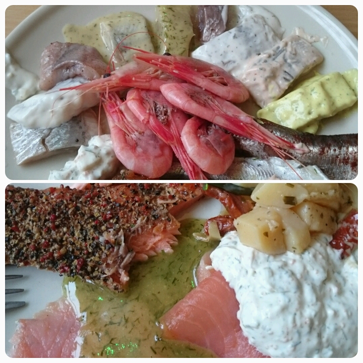 Kvällens höjdpunkt blev naturligtvis fiskbuffen. 10-11 olika sorters inlagd sill, strömningar i olika former, 4-5 olika sorters lax, färska räkor, röror och såser. Hur gott som helst