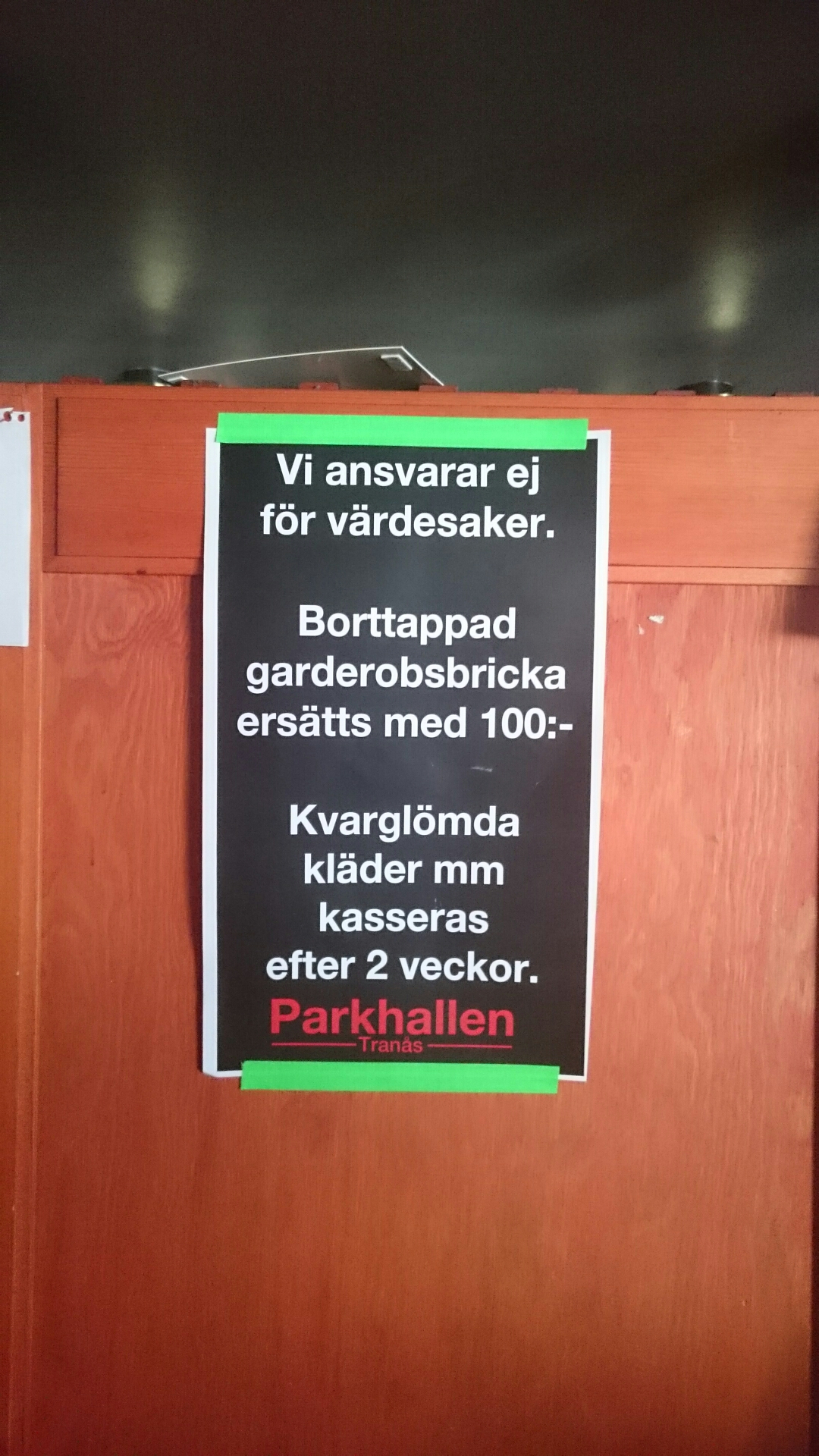 Vi tog en sväng in på Tranåsmässan i Parkhallen. Där såg jag denna skylt. Vi kan väl konstatera att det blev ett rejält syftningsfel. Man får väl gå dit och tappa bort garderobsbrickan emellanåt, så man får nån hundring
