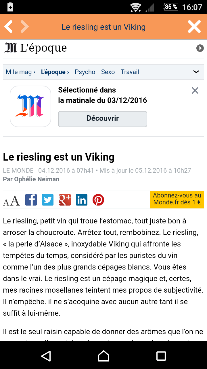 Jo jag får träna både uttal och att skriva, en del ord låter ju lika men stavas olika. Min lärare är svenska men har bott i Frankrike så jag litar på att hon lär mig rätt uttal. Det lilla tidningsklippet jag har inte fått i läxa utan det ramlade jag in på och tyckte det var kul eftersom det stod om vin från Alsace. Jag försöker att kika på lite olika franska texter, lyssna på fransk musik allt för snappa upp så mycket som möjligt. Nordsteds är bra – bläddrat i den och tror mig veta att den kommer som julklapp 😉