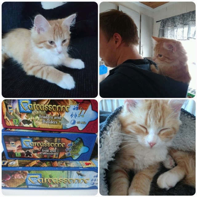 Sedan vi besökte dem senast, har familjen också utökats med en liten kattunge. En liten Saffran, som hon så fyndigt heter. Hon är så klart lite busig men helt plötsligt kan hon nästan somna, mitt i leken. Att ligga i Daniel huva och kika var spännande.