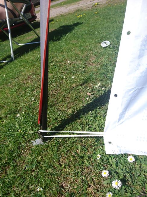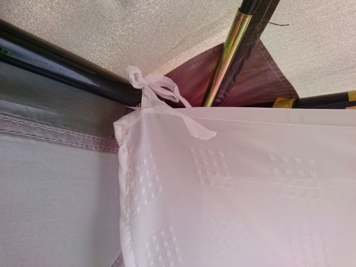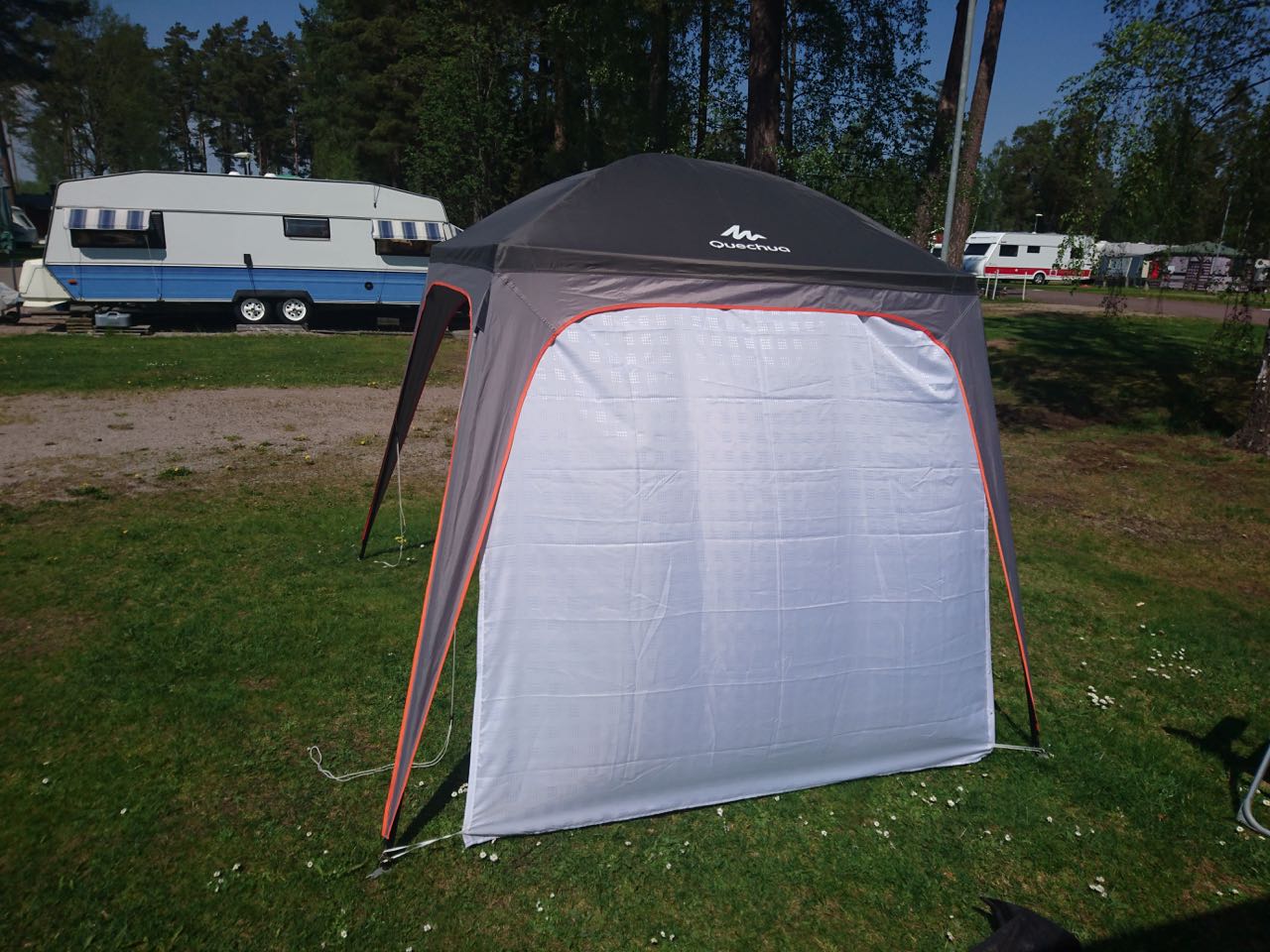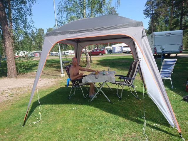 För något år sedan köpte vi en paviljong i stället för den markis vi inte har på husbilen. Denna fyller väl sin funktion men ibland har vi saknat ytterligare skugga. Därför har jag nu försökt att fixa till ett par sidor. Det blir lite man-tager-vad-man-haver men det blev ganska ok. Tog ett överblivet duschdraperi. Det är dock lite för kort på bredden, nertill men det ska säkert skugga bra ändå. Satte knytband i, på ovansidan och ett resår nertill. Skulle det duggregna lite står det väl kanske emot, eftersom det är ett duschdraperi. Samma sak om det blåser. Det borde bli lite lä. Paviljongen som sådan har vi köpt på Decathlon och mäter 2,5 m x 2,5 m och väger endast 8,8 kilo. Du kan se den här.