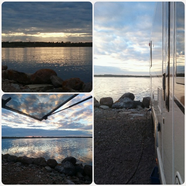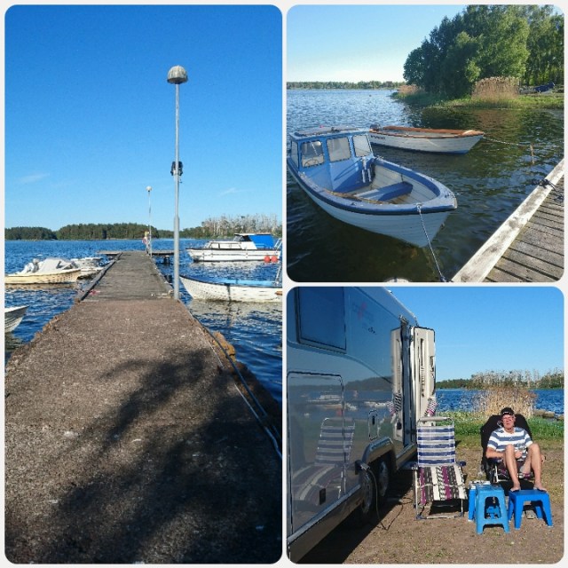 Först tankade vi lite gasol, vid karamellfabriken. Nu står vi på ställplatsen. 150:- inkl el och tillgång till toalett och dusch. Inga tömningsmöjligheter och inte heller fyllning. Men grusplanen erbjuder plats till oss ca 30 husbilar som är här nu. Och fler får plats. Koordinaterna hit är 56.973463, 16.440817