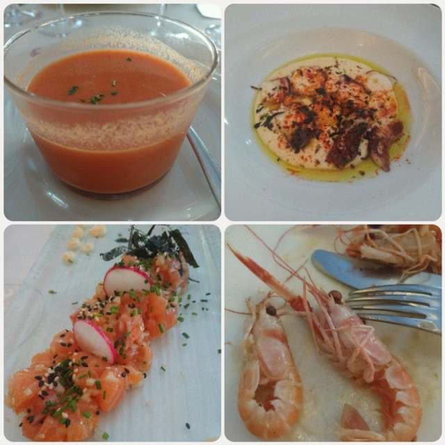 En mycket god Gaspacho, Rökt bläckfisk med smält rökt ost, Laxtartar och Gambas.