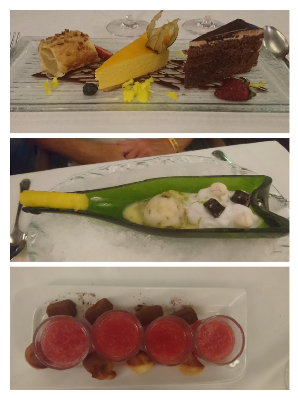 Desserten gick inte heller av för hackor. Dels en med olika tårtbitar samt en fruktsorbet som serverades i en halv vinflaska. Det som ser ut som korken, är en annanasbit. Efter det en vattenmelonshot med två olika tryfflar