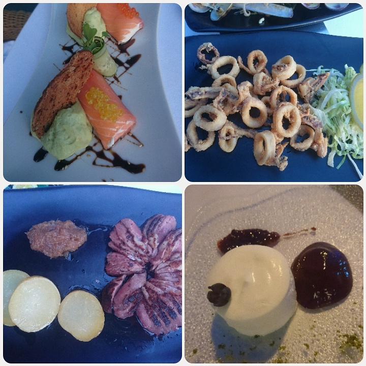 Till förrätt valde jag bläckfiskringar och Göran tog laxrullar. Anka till varmrätt och en grekisk yoghurtmousse till dessert.
