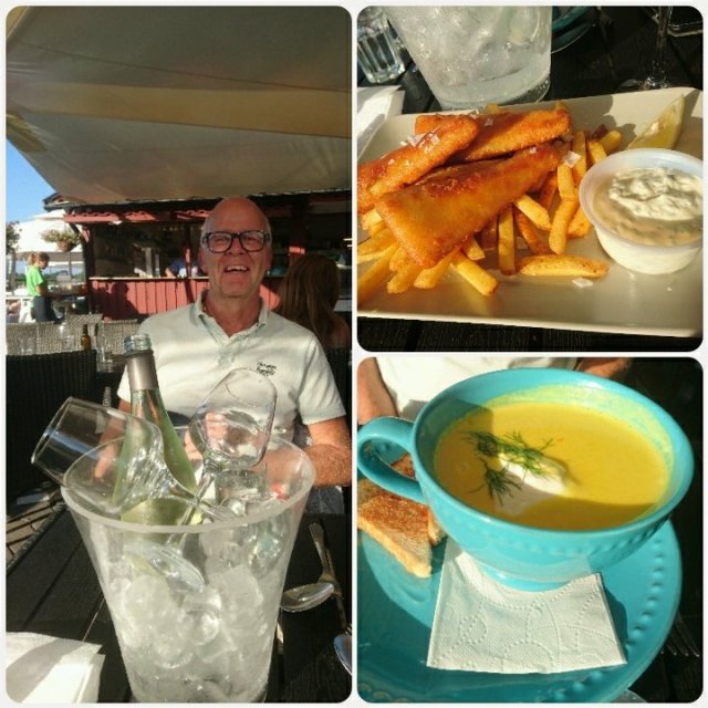 Eftersom Göran fyllde år var vi på restaurang Fiskeboden på kvällen och åt en mycket god fisksoppa / Fish’n chips