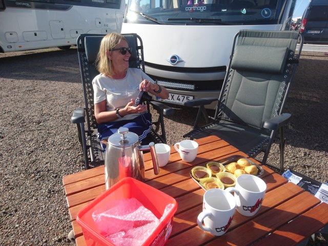 Fika i solen och sedan åt vi surströmming och det var så gott att jag glömde fotografera! Jaja, jag vet att vissa av er inte alls tycker om detta, så visst är det tur att vi gillar olika. Man äter naturligtvis det man själv vill. Vi avrundade med en dessert i vår bil och timmarna formligen sprang iväg.