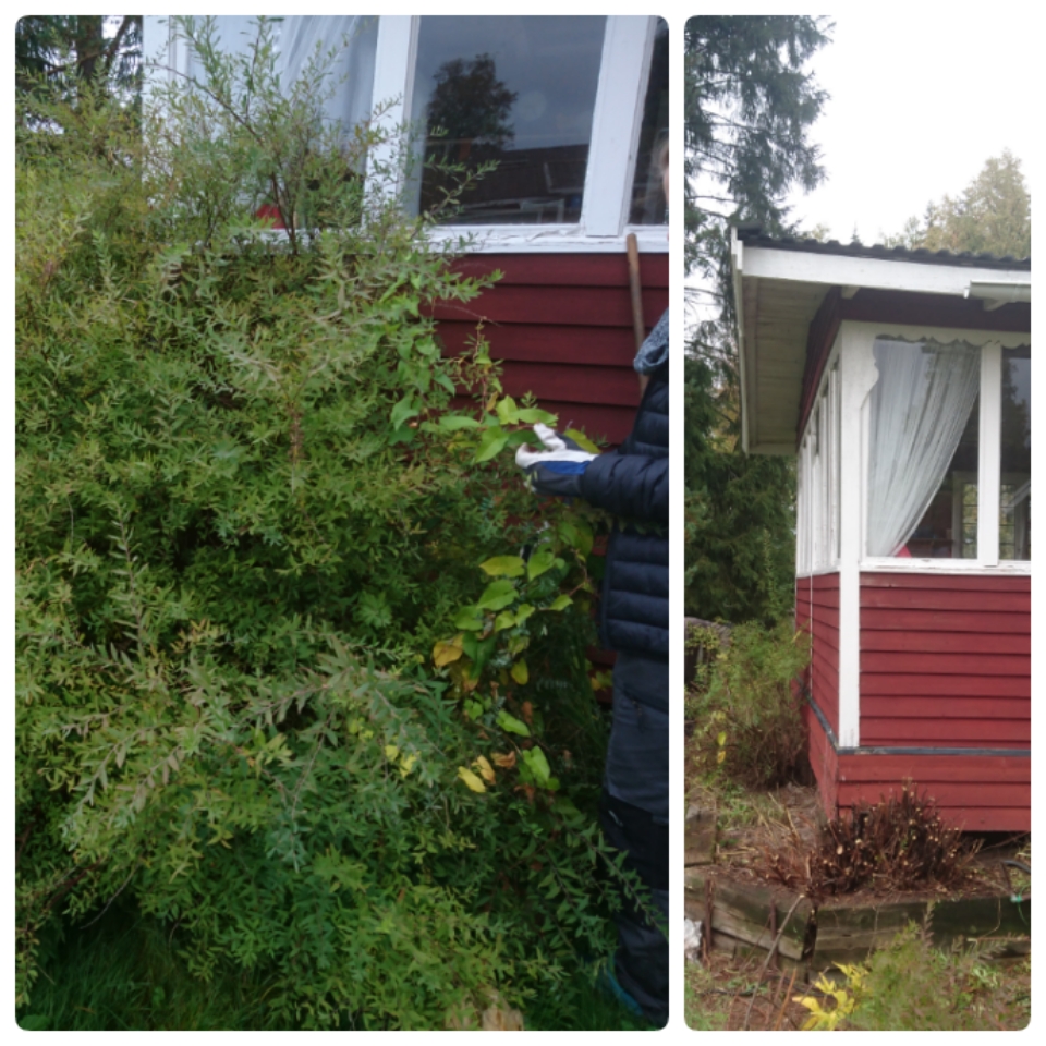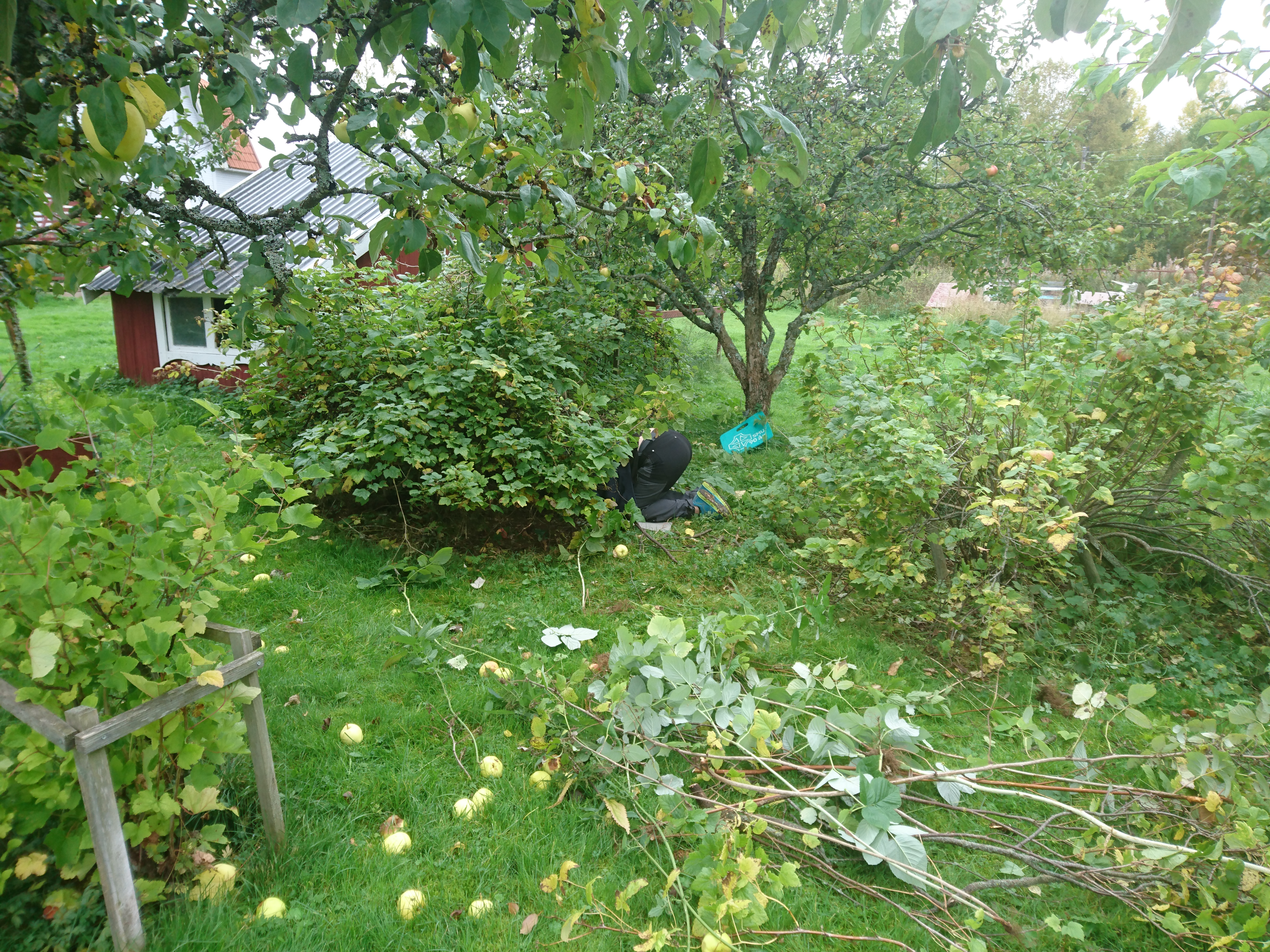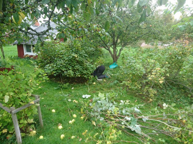 Fredagen ägnades åt röjning ute. 5 av 7 äppelträd blev beskurna. Bärbuskar gallrades. Hallonsnåret började anta form av hallonhäck och Spirean jämnades med marken.