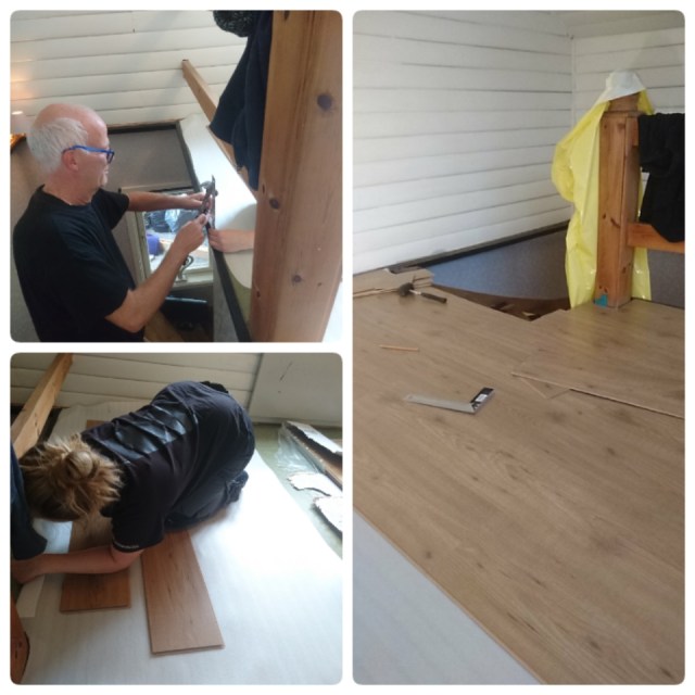 Göran och Ida började lägga golv uppe i hallen