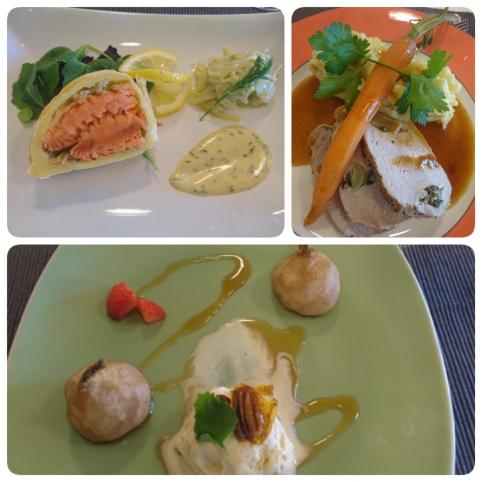 Inbakad lax till förrätt, fläskrygg till varmrätt och glass med inkokt päron till dessert.