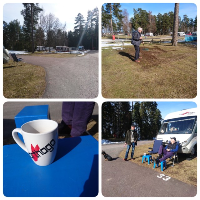 Vi kom ju ut till Hätte Camping och husbilen i fredags. Där fanns också Lasse o Helen. Och strax efter oss rullade Matts o Birgitta också in. Alltid trevligt att träffa goda vänner. Lördagen bjöd på ganska soligt men lite blåsigt väder. Det gick ändå att sitta ute om vi kom i lä. Det blev skapligt varmt och det syntes att snön försvann mer och mer.