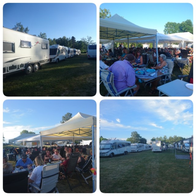 Alla husbilar har markiser, utom vi så vi har snyltat på andras skugga 🤣 Däremot blev det ohyggligt varmt inne i restaurangen, under årsmötet och vid middagen! En regnskur hjälpte inte mycket….