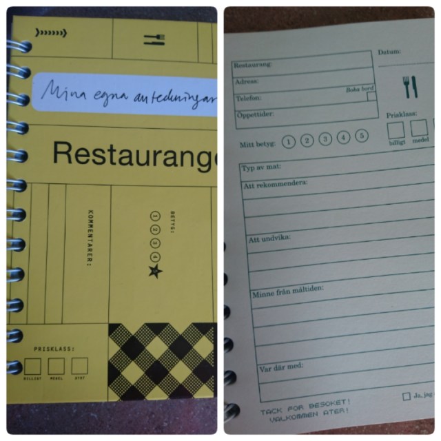 I helgen som var, fick vi en liten present av våra vänner Hasse och Maria. Det var en liten bok. En som vi själva får fylla i. Den heter ”Mina egna anteckningar om Restauranger” Där kan vi fylla i vilken restaurang vi besökt, vad vi åt och vad vi vill rekommendera eller komma ihåg. Kul att göra lite anteckningar för efter ett tag kommer man ju inte ihåg, hur gärna man än vill. Men jag undrar lite över varför vi fick boken. Tycker dom vi äter ute ofta, månntro??