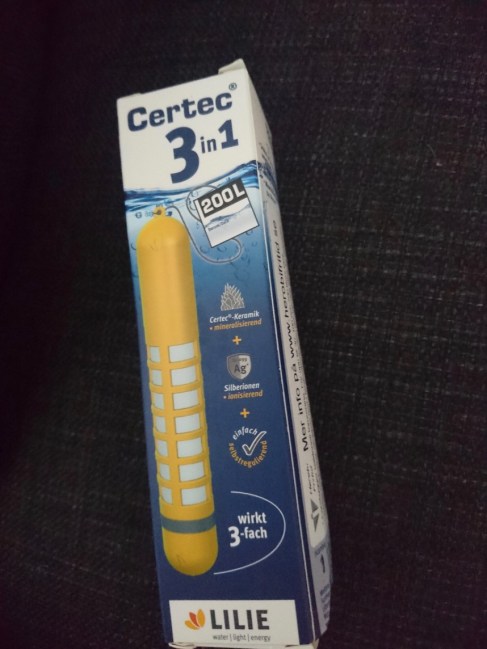 Vi har också, för första gången nånsin, köpt en liten grej, Certec, som ska hålla vattnet i husbilens vattentank rent och fritt från bakterier/alger. Vi har ju under alla år varit noga med att tömma vattnet och skölja ren tankarna med flytande citron och det har alltid fungerat hur bra som helst. Vi har alltid druckit vattnet från taken när vi fyllt i gott vatten från Sverige och norra Europa. Längre söderut smakar det ju ofta klor. Nu tar inte de här silverjonerna bort dålig smak i vattnet, men vi kommer alltid att ha bakteriefritt vatten. Vi har också en liten vattenkanna med kolfilter i, som minskar dålig smak. Säkert kommer vi ändå att släpa hem vatten ibland, i södra Europa. Vi ska nu prova denna lilla mojäng under ett år, så får vi se om vi har blivit silvriga i håret eller blivit självlysande sedan 😀