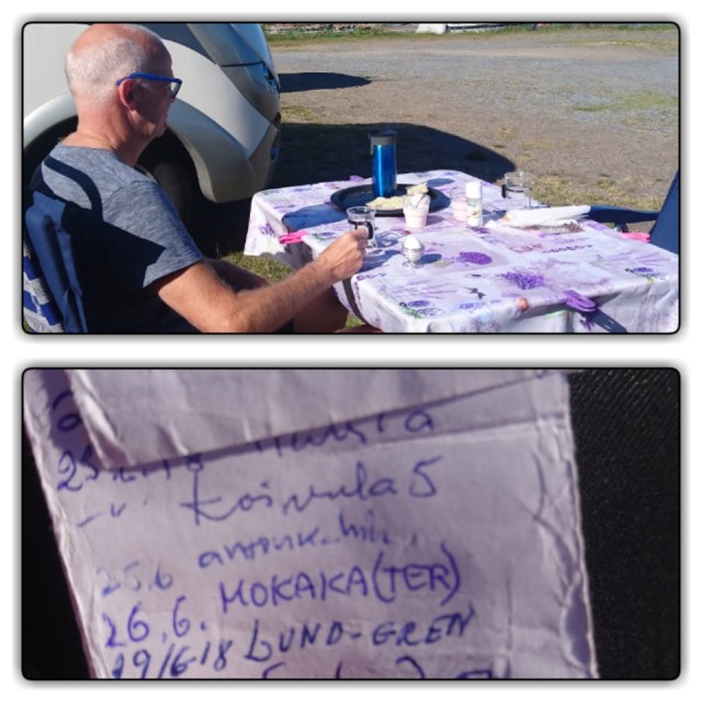 Här i Haparanda Hamn hittade vi en riktigt trevlig ställplats som båtklubben driver. Koordinaterna hit är N 65.77116 E 23.90275 Vi tänkte först bara stanna en natt, men vi är fortfarande kvar. Stillhet, rofyllt och lungt och skönt. Vi har äntligen kunnat äta frukost ute, utan att behöva hålla i allt, eftersom det blåst så tidigare. Vi har hittat nån cache. Vi lyssnar på ljudbok och läser litegrann.