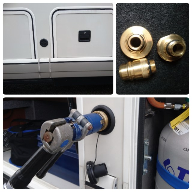 Vi fick också med adaptrar för att kunna fylla i en massa andra länder. Peter, som har verkstaden, följde med oss in till Karlshamn där vi fick en genomgång av hur allt fungerar. Vi fick tuberna tankade (i Sverige får man inte göra det själv) Tankhålet är monterat mellan gasolluckan och ”bussluckan” och det blev så snyggt.