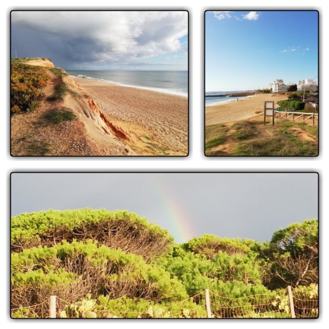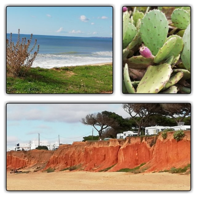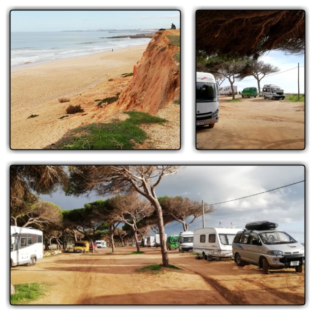 Vi fortsatte vår resa lite österut, idag. Vi hade tittat ut en ställplats alldeles nära Quarteira. Den ligger ”ovanför” havet och det finns endast soptunna. Inga andra faciliteter N37.059679,W8.084513. Den sista biten av vägen hit var, smal och skumpig. Vi fick tyvärr inte plats på första parkett, men det gör ingenting för där lutar det ganska mycket.