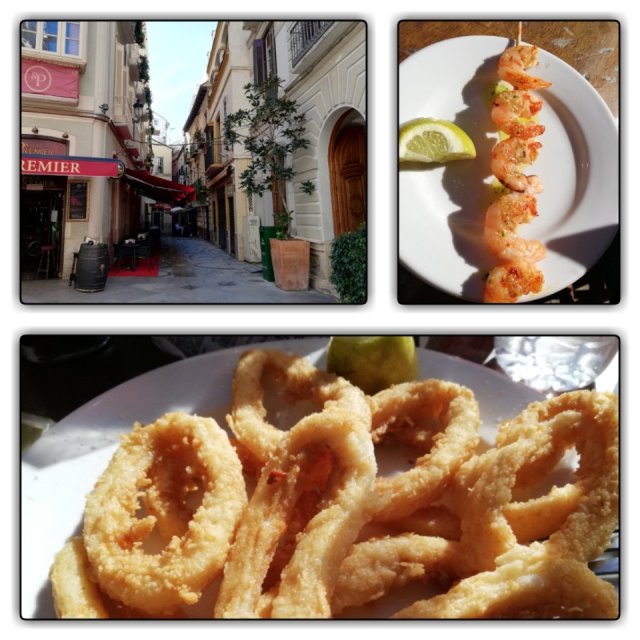 Vi åt lite lunch på ett ställe mitt i gamla stan (det fanns många att välja på) Det blev lite bläckfiskringar och räkspett.
