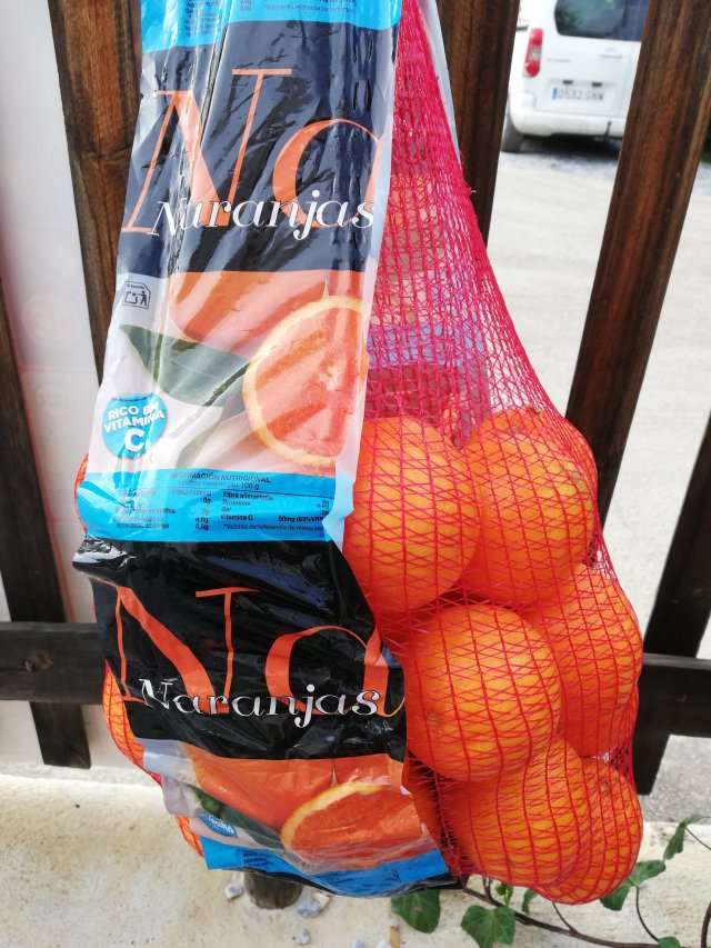 Här nere kan vi verkligen frossa i frukt och grönsaker. De har mognat på plats och smakar så mycket mera. Tänk dej en solmogen, saftig apelsin. Finns det nåt godare? Denna 6 kg kasse köpte vi på Mercadona och vi betalade € 0.56 per kilo. Förresten – undras om apelsinerna vill bli juice, eller om de pressas till det…. 🤣