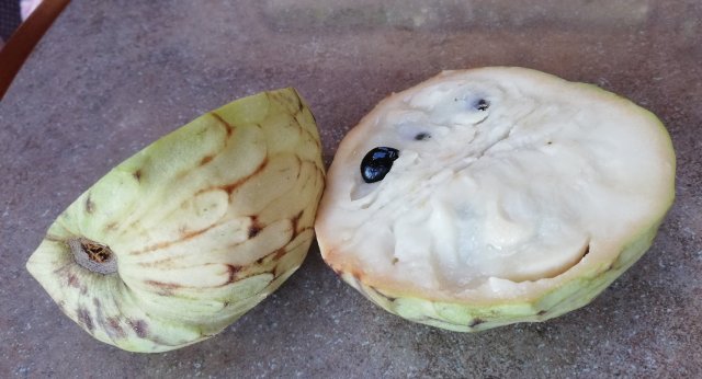 Idag smakade vi en Cherimoya för första gången. Det var en otroligt god och krämig frukt. Jag tyckte den påminde lite om jordgubbar och grädde. Den sägs ha läkande egenskaper och den är även rik på kostfiber som hjälper till att förhindra absorption av kolesterol i tarmen. Kostfiberna hjälper också skydda slemhinnan i tjocktarmen från exponering av giftiga ämnen. Cherimoya innehåller flera antioxidanter och har visat sig ha anti-cancer och anti-malaria egenskaper. Så har frukten ett väl avvägt natrium/kaliuminnehåll. Bra kalium i kroppen hjälper hjärta och blodtryck. Rena mirakelfrukten om man ska tro på det som skrivs! Oavsett är den så god så det blir nog en om dan framöver ☺️