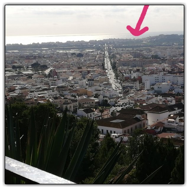 Vi pilen ungefär ligger camping Torre del Mar som vi bor på. Längst bort där land möter hav.