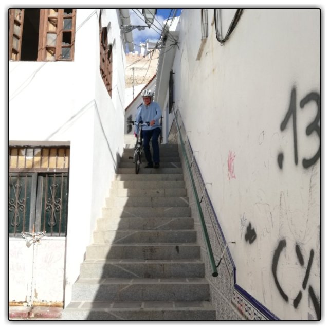 Det var flackare väg dit än jag trott. Vi passerade det stora köpcentrat El Igenio. Men som sagt, vi passerade. När vi kom in i stan blev gränderna smalare och brantare.