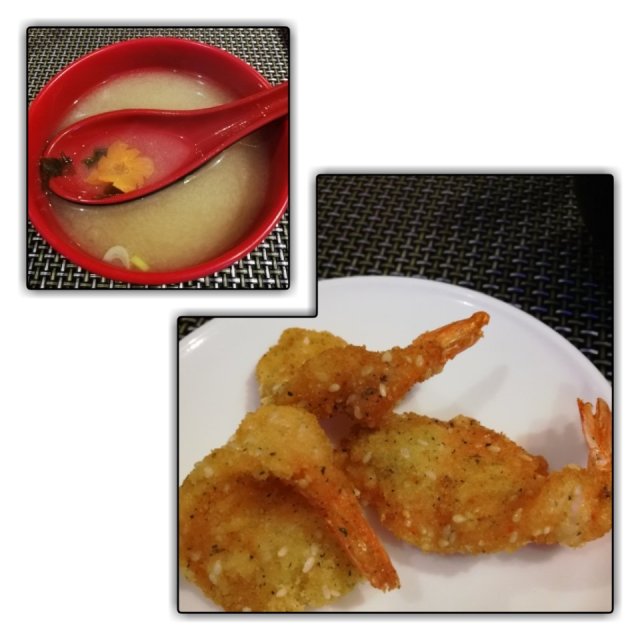 Först fick vi en Miso-soppa. Sedan kom det några räkor.