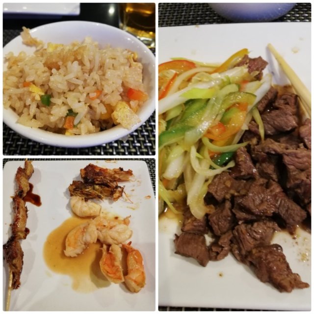 Stekt ris med ägg och grönsaker, kycklingspett, räkor och flamberad biff med varma grönsaker.