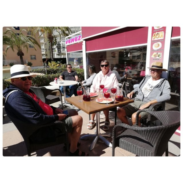 Igår hade vi en skön, men ganska blåsig dag. Men vi njöt ändå av folkliv i Calpe. Vi knallade iväg på en promenad och stannade till för en vätskekontroll utefter strandpromenaden. Det blev sangria och lite Serrano skinka och ost.