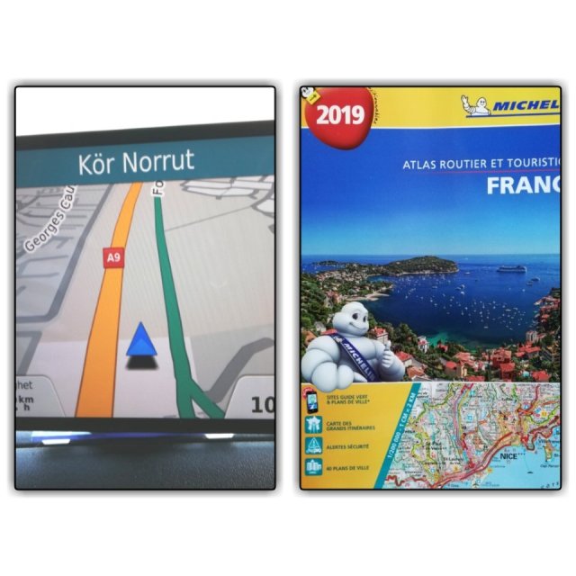 Strax efter att vi passerat gränsen till Frankrike fick GPSen ett knäppryck. Vår inprogrammerade väg försvann och vi skulle ”kör norrut” Jotack – det var ju det vi gjorde. Tack vare vår hederliga gamla karta körde vi rätt ändå. Den kartan har nu gjort sitt, den faller snart isär och vi har införskaffat en ny. GPSen funkar för övrigt som den ska igen.