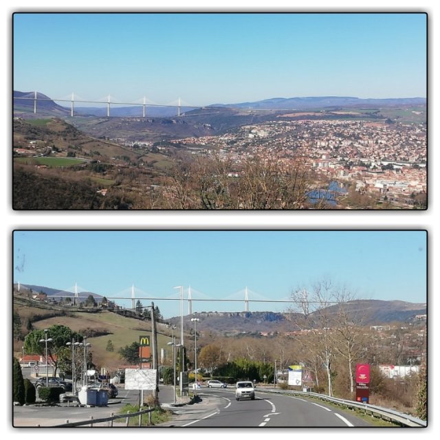 Vi for gratismotorvägen A75 mot Clermont-Ferrand. Den är lite backig och lite kurvig men bred och bra. När vi kom vid Millau, valde vi att åka nerför, genom stan och se den spektakulära bron på håll.