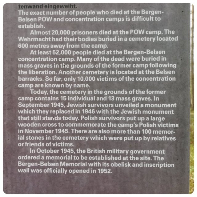 Det här blev ingen helt vanlig söndag. Vi har flera gånger sagt att vi ska stanna till vid det forna koncentrationslägret Bergen Belsen, som ligger strax norr om Celle, i norra Tyskland. Idag blev det av.