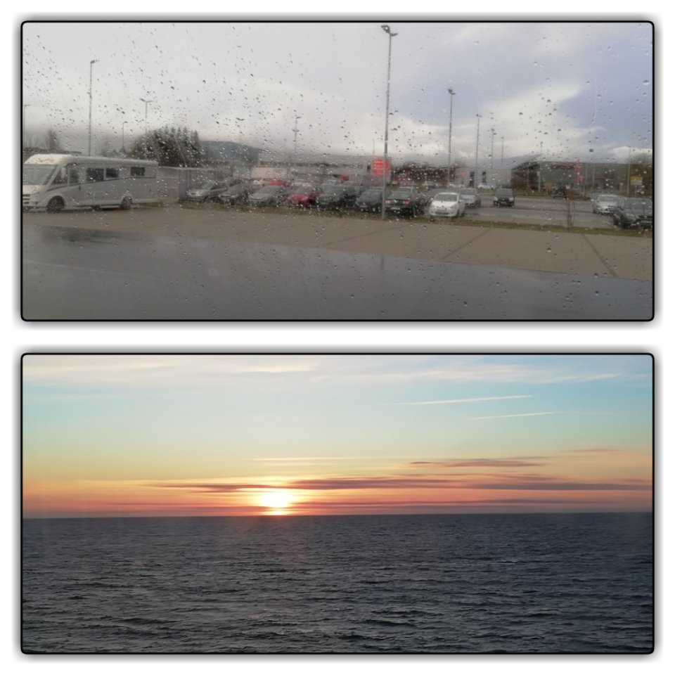 Vi for vidare upp på E45/A7 in i Danmark och till Grenå. Under tiden Göran körde bokade jag färjan som gick kl 14.20 Vi valde att vänta in i det sista eftersom väderappen visade ganska hård blåst. Men den visade fel. Även genom Danmark rullade det på med ganska lite trafik. Det är ju ändå måndag nu. Vi tankade också i Grenå. Där kostade dieseln 9.79 dkr/l så det var ju ändå billigare än här hemma.