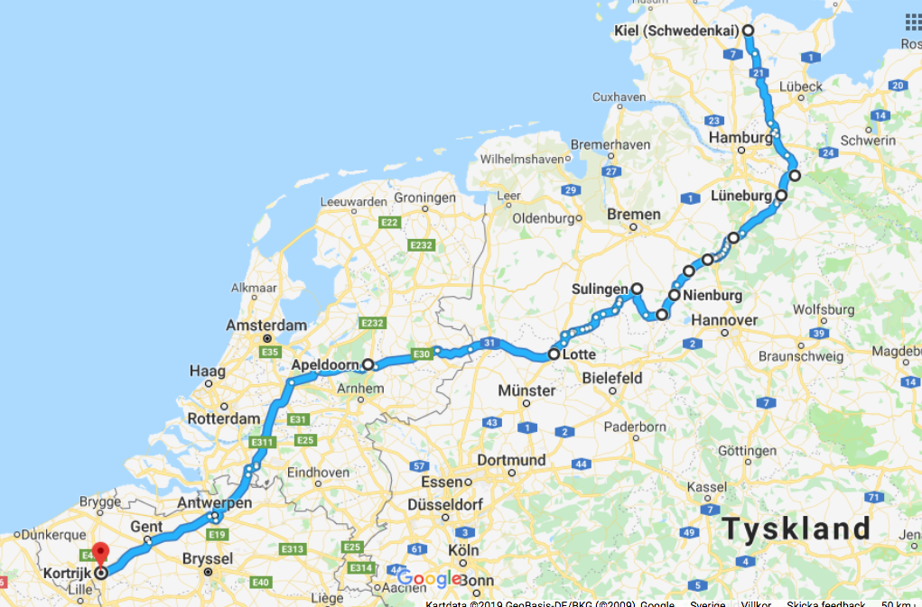 Vägval kan ju betyda olika saker, men här tänker jag närmast på vilka vägar vi körde på våran första övervintringsresa, som sträckte sig från 7/10 2018 – 27/3 2019. Vi började i Kiel eftersom vi färjade Göteborg-Kiel. I Tyskland valde vi uteslutande att köra på Bundestrasse då vi fått rapporter om många vägarbeten och oändliga köer. Här kommer nu en sammanfattning med vägar vi kört och stopp vi gjort, samt en och annan hänvisning till blogginlägget jag skrivit om ställplatsen eller campingen. På vissa orter har vi ju stått länge och då kan du klicka dej vidare till alla inlägg om den orten.