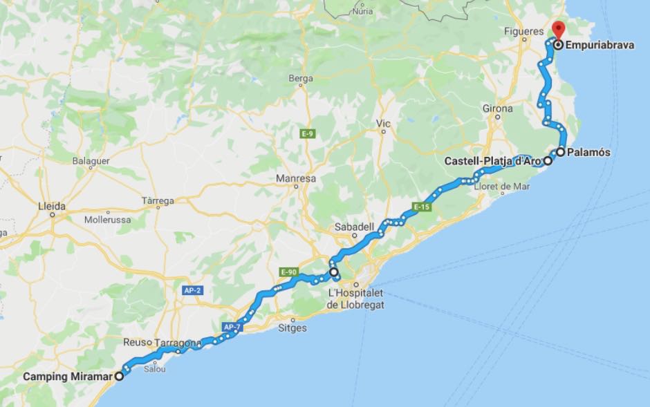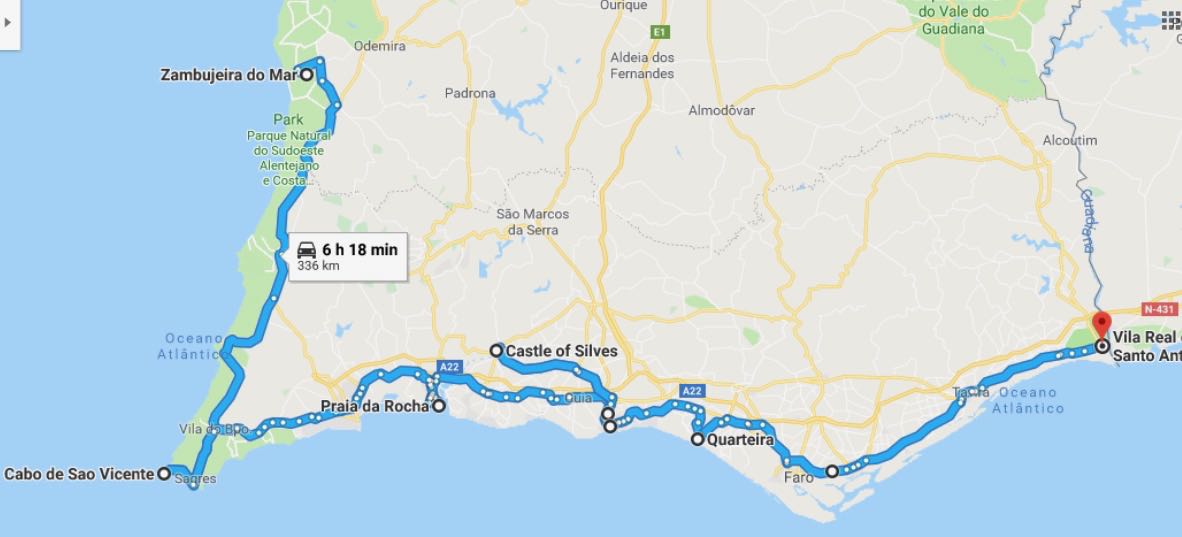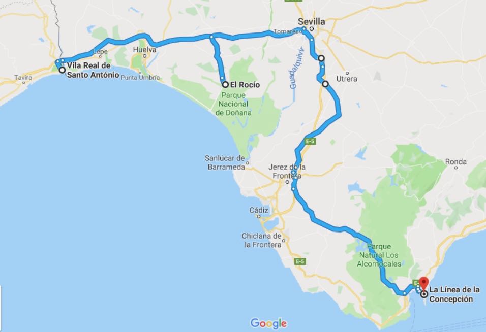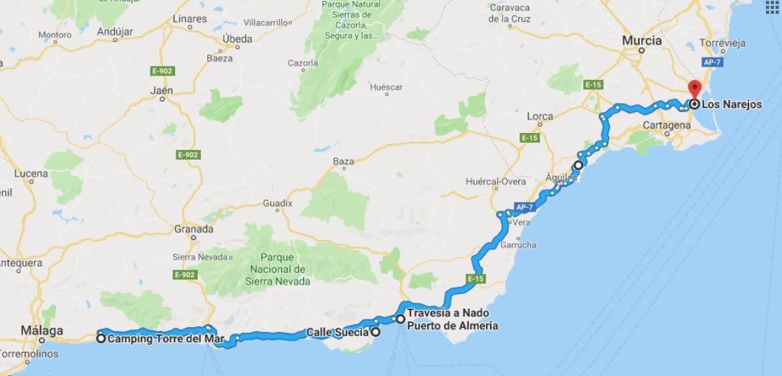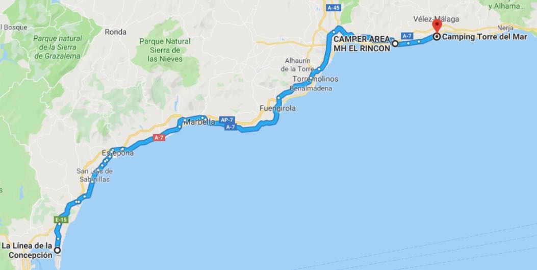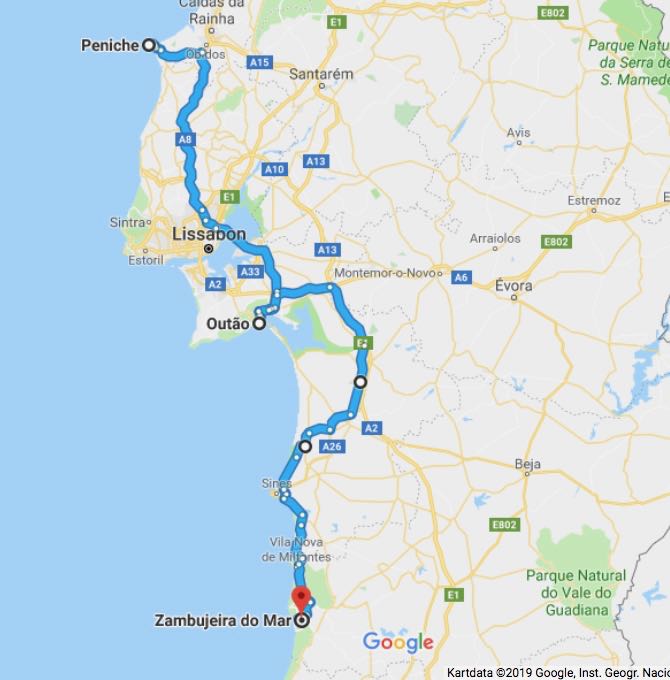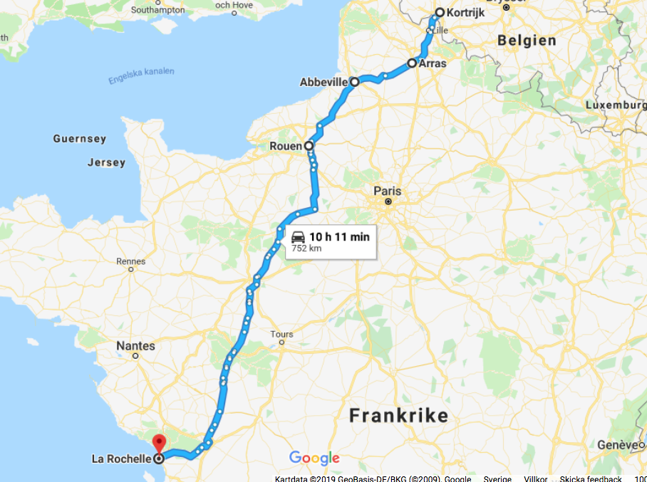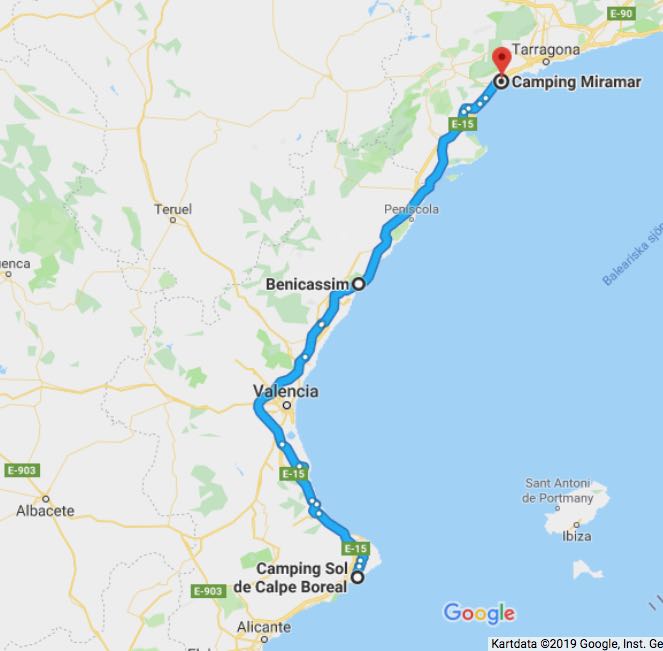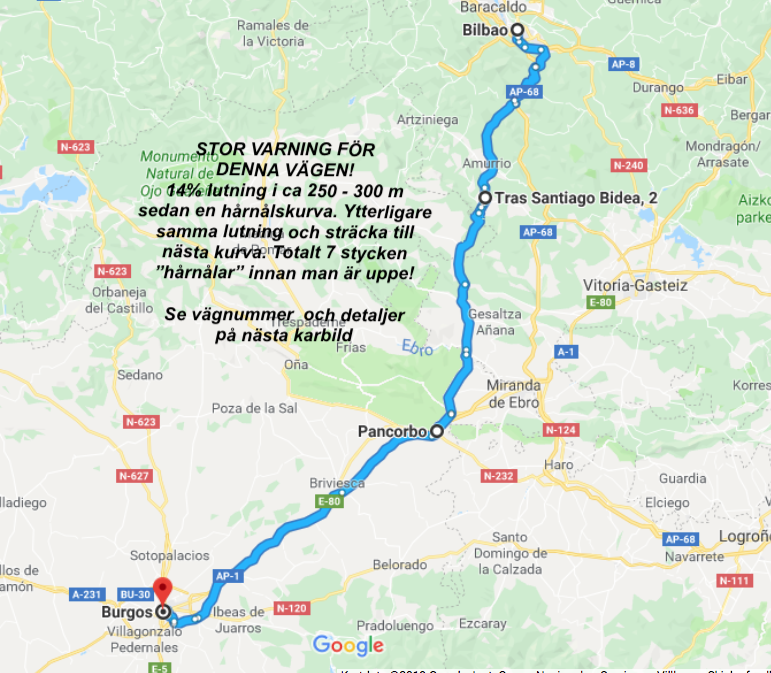 Vår första övernattning blev i Sulingen Efter Nienburg var det ”umleitung” så vi fick köra en liten omväg. Nästa stopp blev i Belgien och KortrijkEtt stopp i Frankrike, ca 3 mil N om Le Mans och sedan mötte vi Atlanten vid La RochelleEfter La Rochelle stannade vi på en vingård, Marquis de Vauban i Blay. Där stod vi parkerad mellan vinstockarna. Nästa stopp blev Andernos-de-Bains där vi åt goda skaldjur. Vi fortsatte att äta, Pinxtos, i San Sebastian. Därefter blev det ett par nätter i BilbaoSom du ser på dessa två bilder här ovan är detta en väg jag starkt rekommenderar att du väljer bort!Allt gick ju bra på skräckvägen här ovan och under natten andades vi ut i en liten by, inte långt från Valladolid Nu for vi in i Portugal. Vid markeringen Service Easytoll Portagem Electronics ca 1 mil innanför portugisiska gränsen, kan man registrera sitt betalkort för att köra på betalvägar, de sk EasyTollvägarna. Vi hamnade först i Costa Nova med sina randiga hus Och sedan blev det en dryg vecka i PenicheEn natt i Ouato, Setubal och sedan en helg på camping i Zambujeira do MarSovplats på Algarvekusten hittade vi i Portimao, Albufeira camping, Silves, Albufeira ställplats samt Quartiera och Vila Real Santo AntonioNu blev det Spanien och ett besök i El Rocio och Gibraltar stod på vår ”bucket-list”Eter Gibraltar for vi öster om Malaca och till Benagalbon och ställplatsen El Rincon och sedan vår ”vinterplats” camping Torre Del Mar, i stan med samma namn.Efter nästan 2,5 månad är det dags att rulla igen. Nu till Roquetas del Mar där vi stod på den passande gatan Calle Suecia. En natt i Almeria hamn och sedan till Los Narejos När vi sedan fortsatte, besökte vi IKEA i Murcia och sedan CalpeEn natt blev det på en parkeringsplats strax utanför Benicassim och sedan blev det camping igen, Miramar i Miami Platja Vi passerar Barcelona och far upp till Platja D`Aro, Palamos och EmpuriabravaNu har vi lämnat Spanien bakom oss och far upp genom Frankrike. Stannar i Marseillan Plage, Molinet samt Belfort Det blir ett par nattstopp i Tyskland. I Bockenem och vid Citti-Park i FlensburgVi färjar över Grenå – Varberg under eftermiddagen och då blir det nattstopp i Varberg