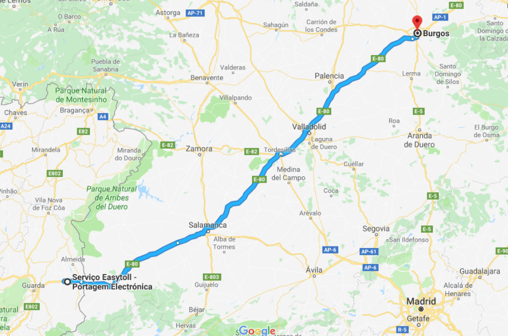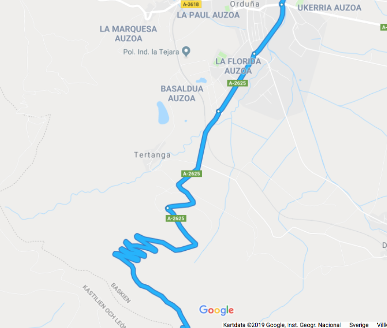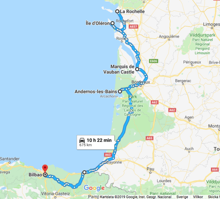 Sedan har vi ju inte så långt hem från Varberg. Detta var i lite grova drag de vägar vi kört. Jag har verkligen försökt pilla med google maps, så den inte ska välja betalvägar mellan orterna, för de enda vi kört betalväg är lite grand i Portugal. Det finns så många alternativa vägar och när man inte haft några måsten eller tid att passa fungerar det utmärkt att ta det lite lugnt. Man får ju dessutom se så mycket mer, än om man åker motorväg. (om man bortser ”skräckfärden” strax efter vi lämnat Bilbao) Totalt har vi kört 8930 km