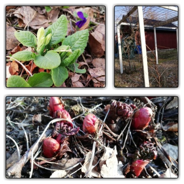 Det grönskar och det är spännande att se vad som kommer upp. De flyttade in i vintras, och ingen vet vad som finns under lövhögarna. Men vi har hittat en del, bla gullvivor och rabarber..
