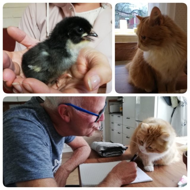 De hade fått små kyckling och det var så söta. Missen Saffran är nyfiken. Både på kycklingarna och när Göran skriver.