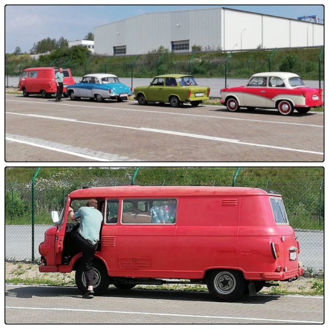 Till färjan var det…. Ett kul gäng som körde av färjan medan vi väntade att köra på, var dessa Trabanter. Så gulliga.