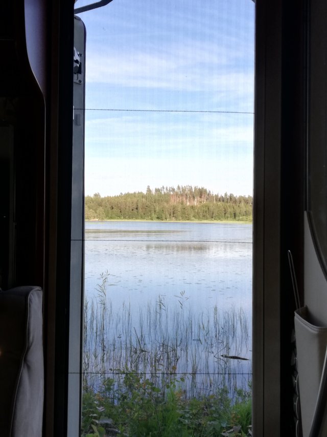 Nu sitter vi inne i husbilssoffan. Men vi har dörren öppen och ser ut genom myggnätet